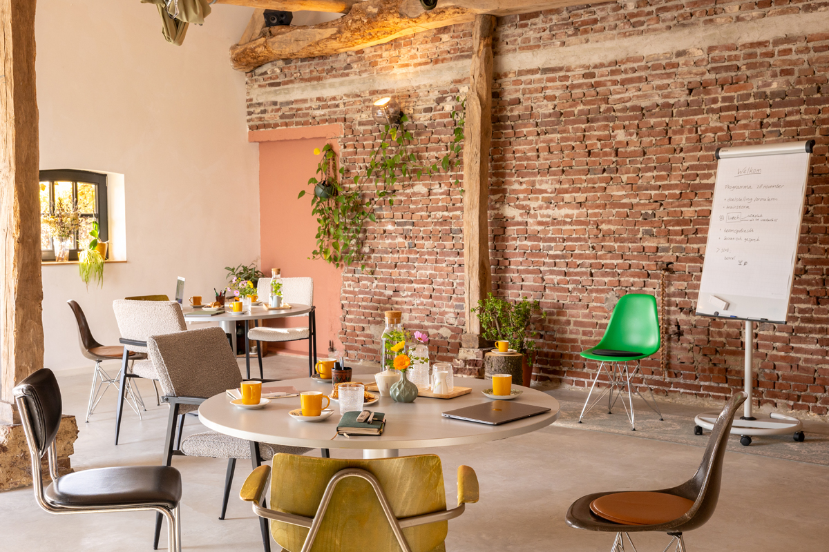 De tuinkas heet kiem. Voeding staat centraal in deze omgebouwde oude melkkamer (50 m2). Hier wordt gestekt, ontspruiten planten, maar mogen ook ideeën ontkiemen. Je kunt je hier terugtrekken met je laptop om ongestoord te werken met uitzicht op de wilde planten en de meer dan 100 jaar oude walnotenboom. Deze ruimte is ook geschikt voor een breakoutsessie, coachgesprek of een creatieve workshop met een kleine groepje. In het groen, tussen de planten.